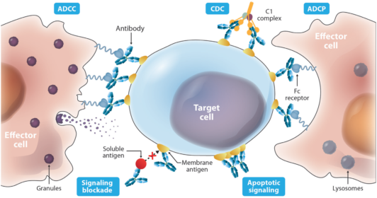 一般IgG类抗体产生作用是通过ADCC (Antibody-Dependent Cell-mediated Cytotoxicity)、ADCP (Antibody-Dependent Cellular Phagocytosis) 和CDC (Complement-Dependent Cytotoxicity) 作用机制,如图1所示。